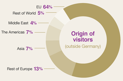 來(lái)自德國以外的參展商和觀(guān)眾的比例分別為48%和34%,海外參展商的比例繼續有所增加,但海外觀(guān)眾的比例有輕微下跌。繼德國之后參展商最多的國家分別是:意大利、土耳其、中國、荷蘭、瑞士、西班牙、奧地利、法國和美國。繼德國之后觀(guān)眾最多的國家分別是:奧地利、荷蘭、瑞典、瑞士、英國、意大利、丹麥、比利時(shí)、印度、捷克共和國和波蘭。