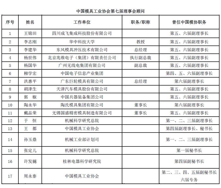 中國模具工業(yè)協(xié)會(huì )第七屆理事會(huì )顧問(wèn)