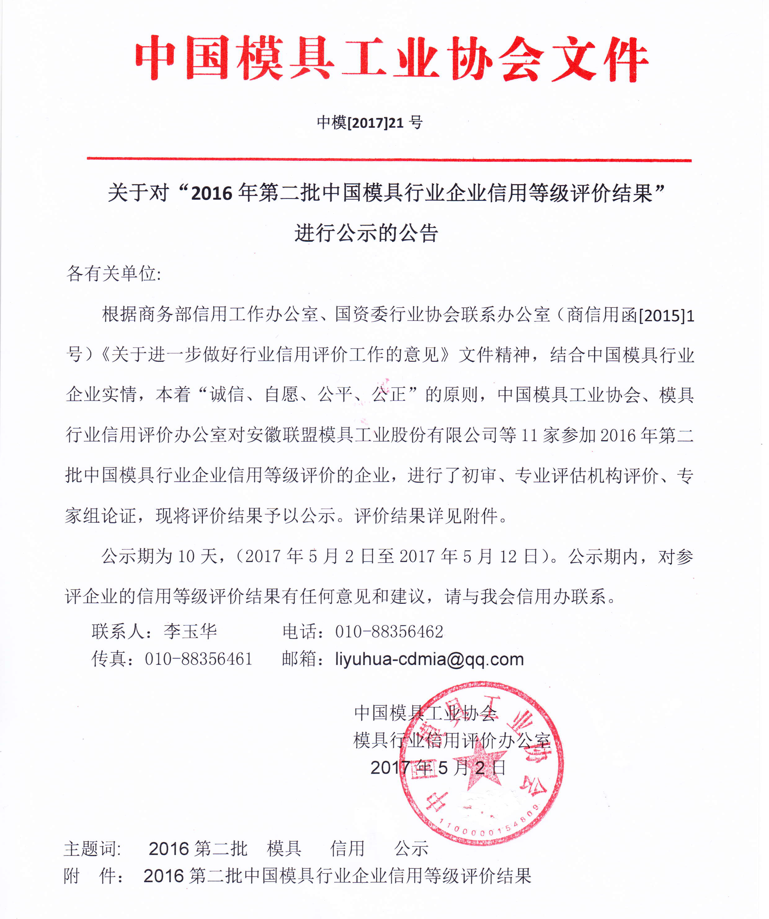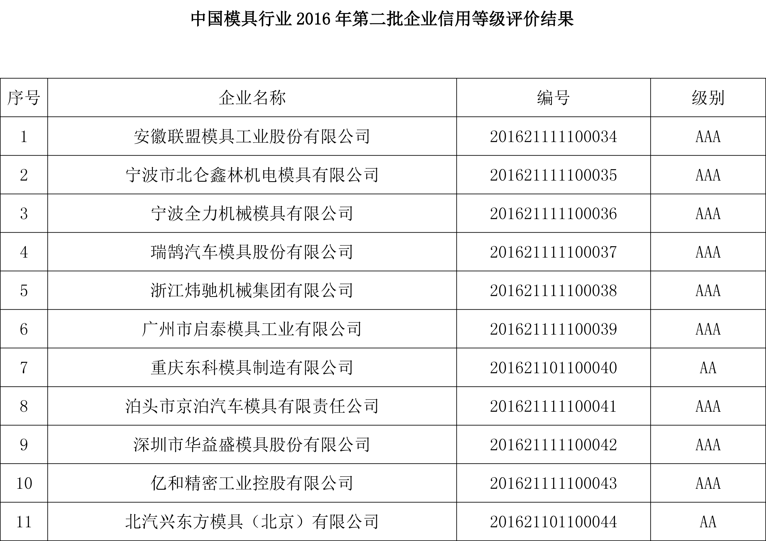 關(guān)于對“2016年第二批中國模具行業(yè)企業(yè)信用等級評價(jià)結果”進(jìn)行公示的公告