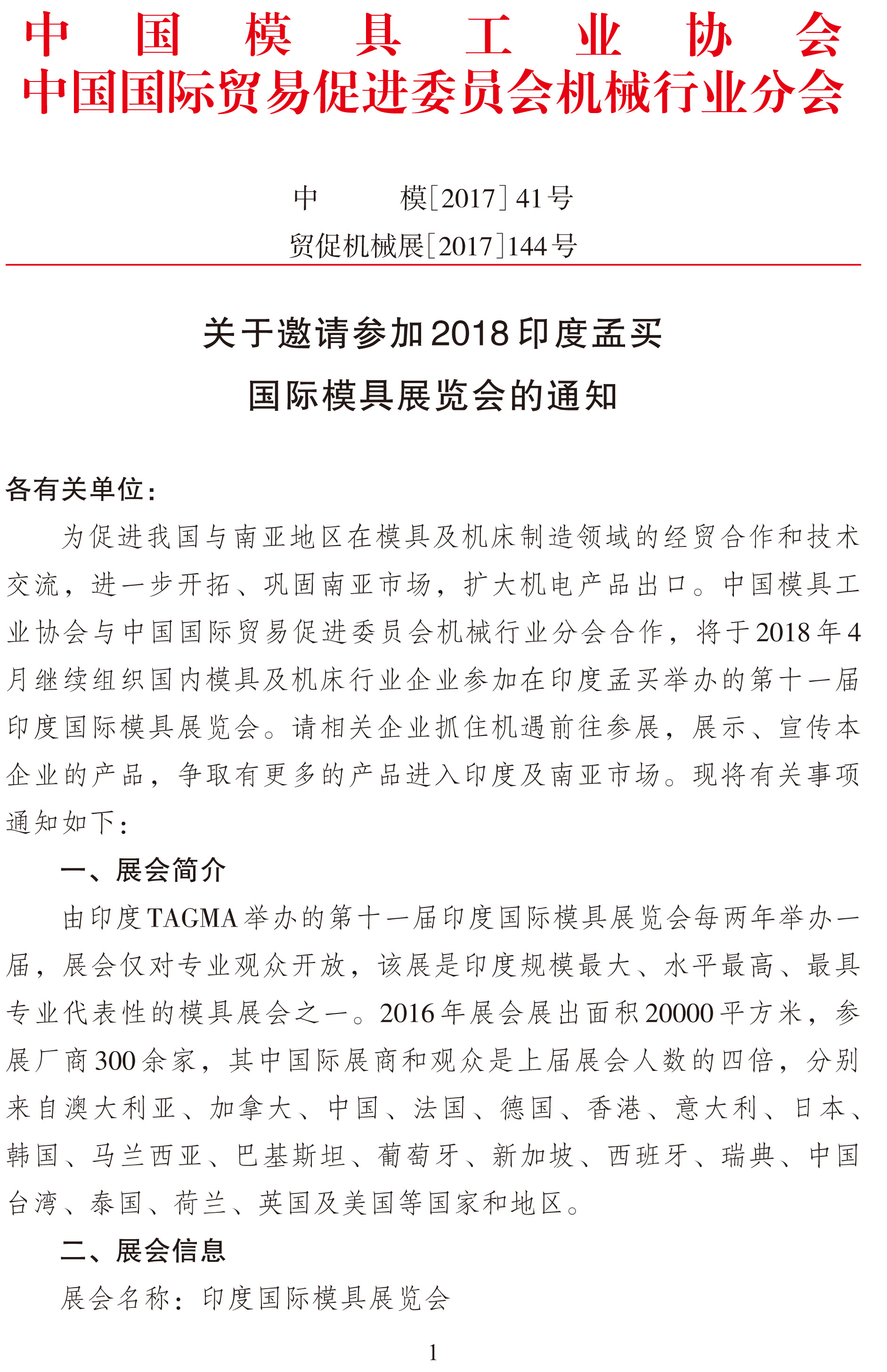 關(guān)于邀請參加2018印度孟買(mǎi)國際模具展覽會(huì )的通知