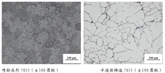 噴射成形技術(shù)可大幅度提升凝固過(guò)程中的冷卻速率,采用該技術(shù)制備的合金晶粒為細小等軸晶,微觀(guān)組織均勻,無(wú)宏觀(guān)偏析。噴射成形7055鋁合金與半連續鑄造7055鋁合金的金相對比見(jiàn)圖2。