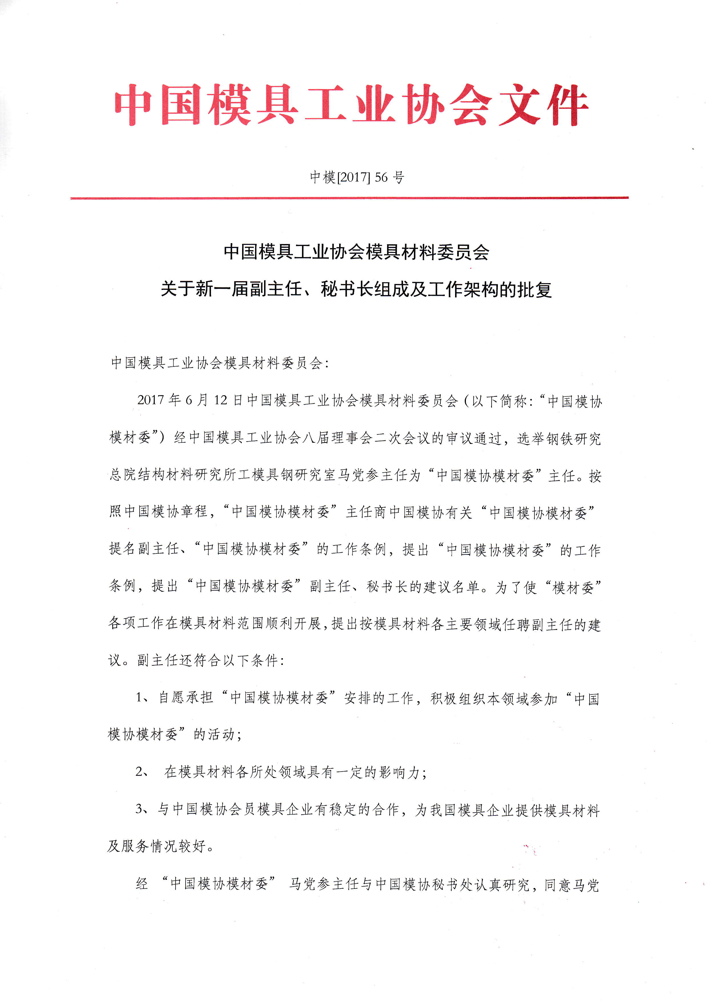 模具材料委員會(huì )關(guān)于新一屆副主任、秘書(shū)長(cháng)組成及工作架構的批復