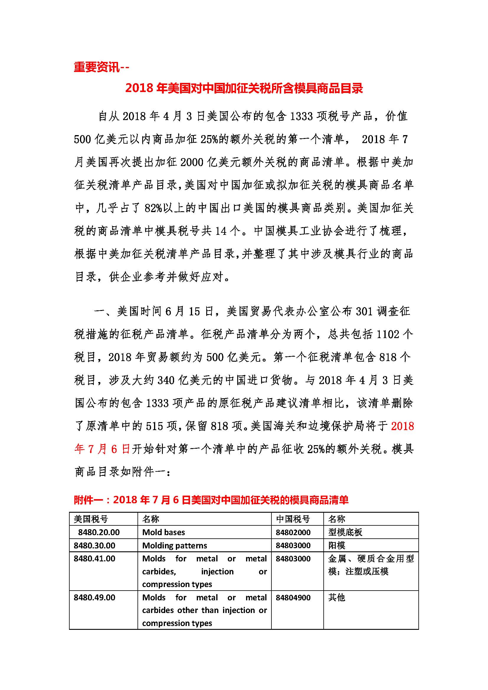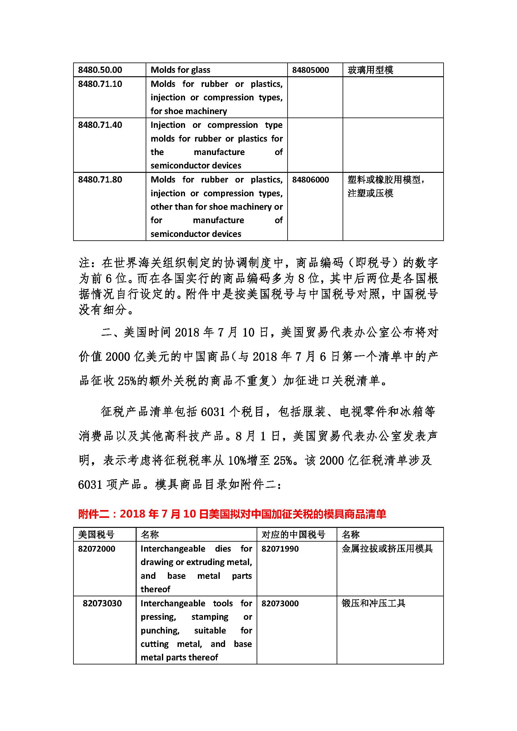 2018年美國對中國加征關(guān)稅所含模具商品目錄