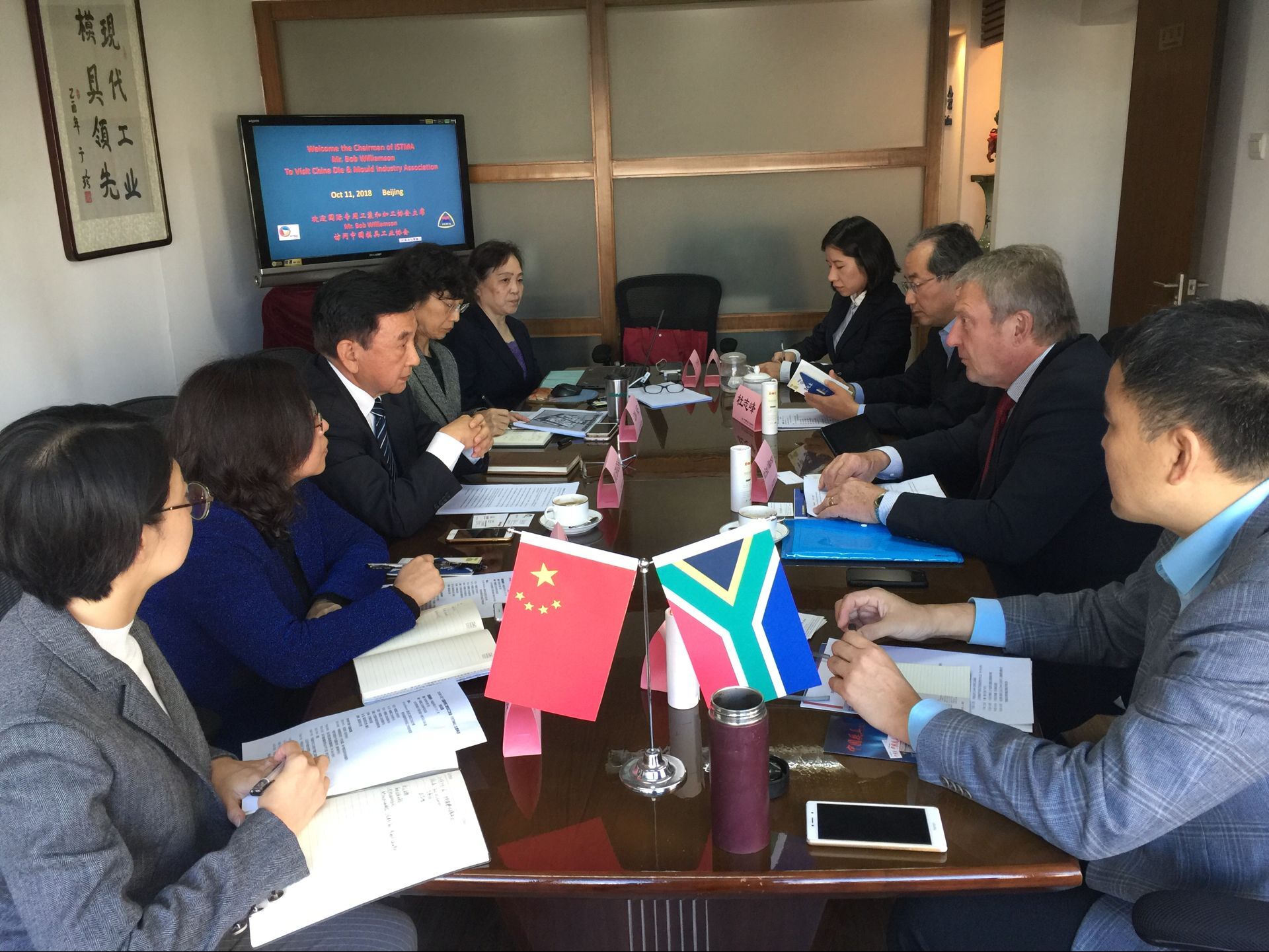 在金磚國家合作五周年,北汽整車(chē)南非基地一期建設即將完成之際。2018年10月11日,國際專(zhuān)用工裝和加工協(xié)會(huì )(ISTMA)主席Mr.Bob Williamson到訪(fǎng)中國模具工業(yè)協(xié)會(huì )秘書(shū)處。中國模具工業(yè)協(xié)會(huì )會(huì )長(cháng)武兵書(shū),秘書(shū)長(cháng)秦珂,副秘書(shū)長(cháng)李玉華、張淑杰,北汽國際采購部負責模具專(zhuān)家左喜順,北汽模具總經(jīng)理杜志峰,中國模具工業(yè)協(xié)會(huì )國際部項目主管高媛、田慧卿參加座談。