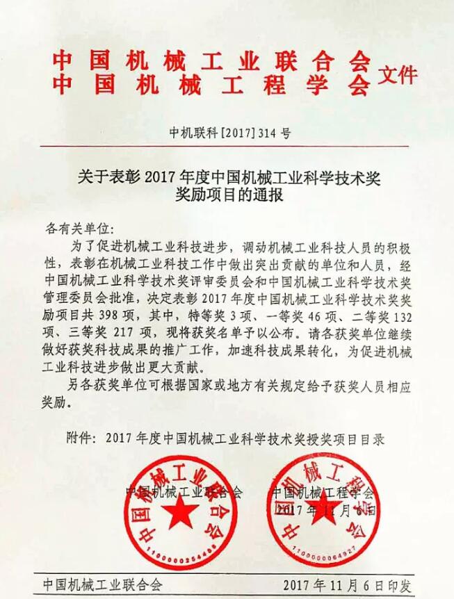 2017年度“中國機械工業(yè)科學(xué)技術(shù)獎”評審工作已經(jīng)結束,經(jīng)過(guò)各專(zhuān)業(yè)評審組初評和評審委員會(huì )終評,共評出獎勵項目398項,其中,特等獎3項、一等獎46項、二等獎132項、三等獎217項?,F將中國模具工業(yè)協(xié)會(huì )會(huì )員單位的獲獎名單予以公布。