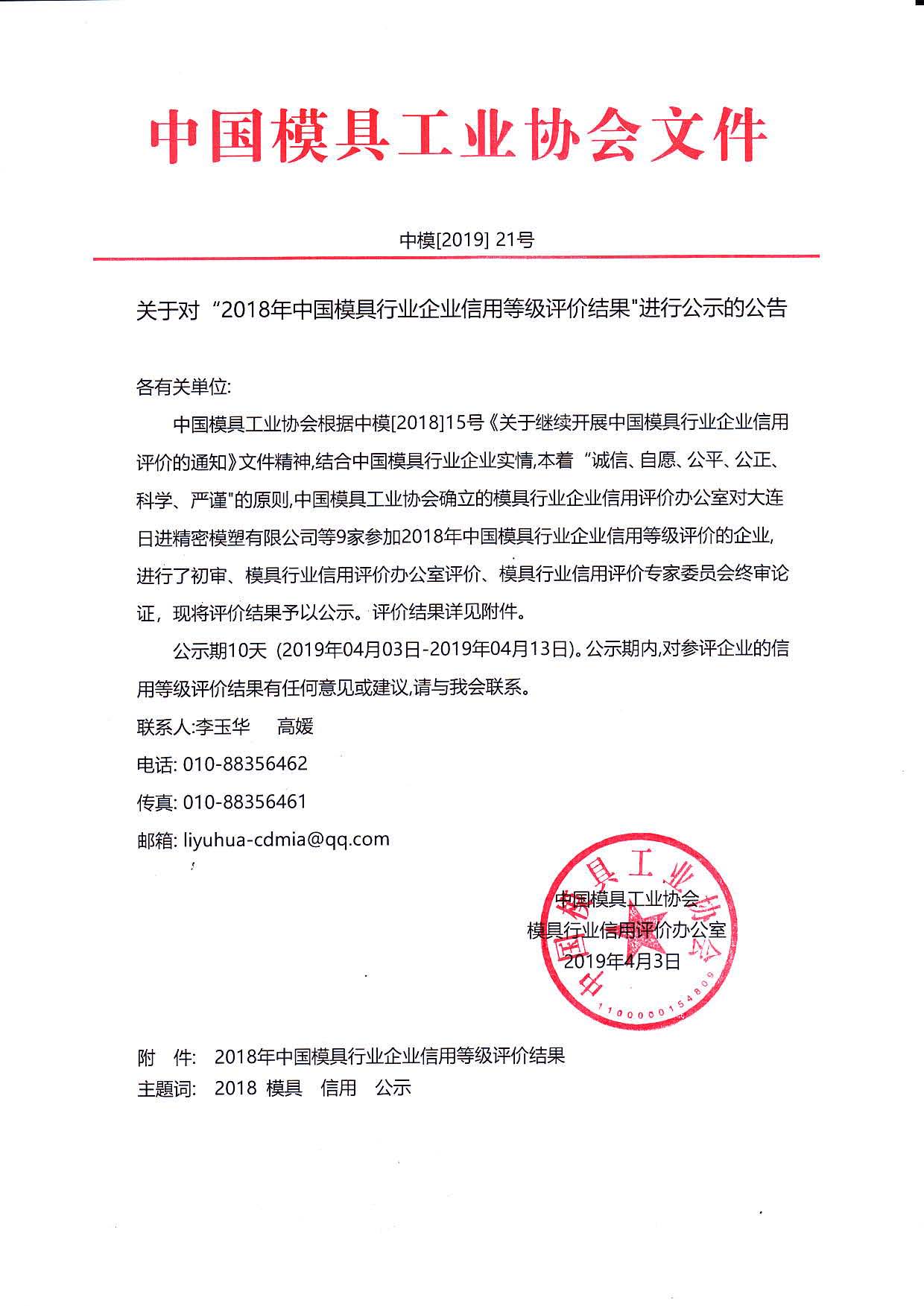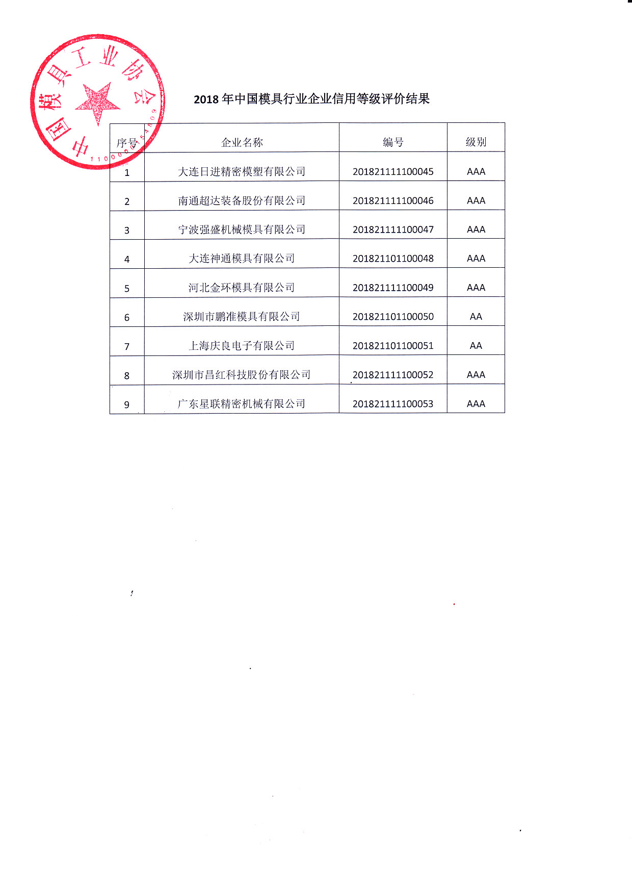 關(guān)于對“2018年中國模具行業(yè)企業(yè)信用等級評價(jià)結果”進(jìn)行公示的公告