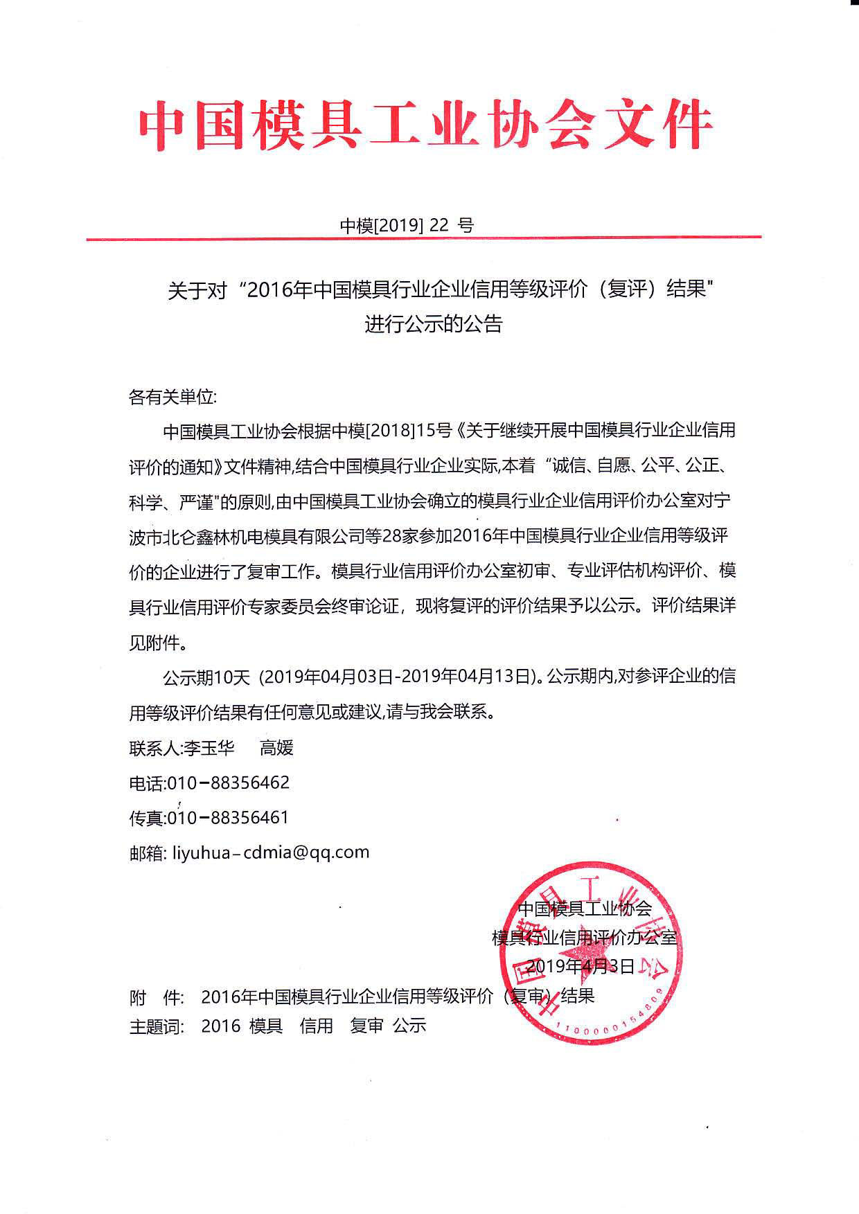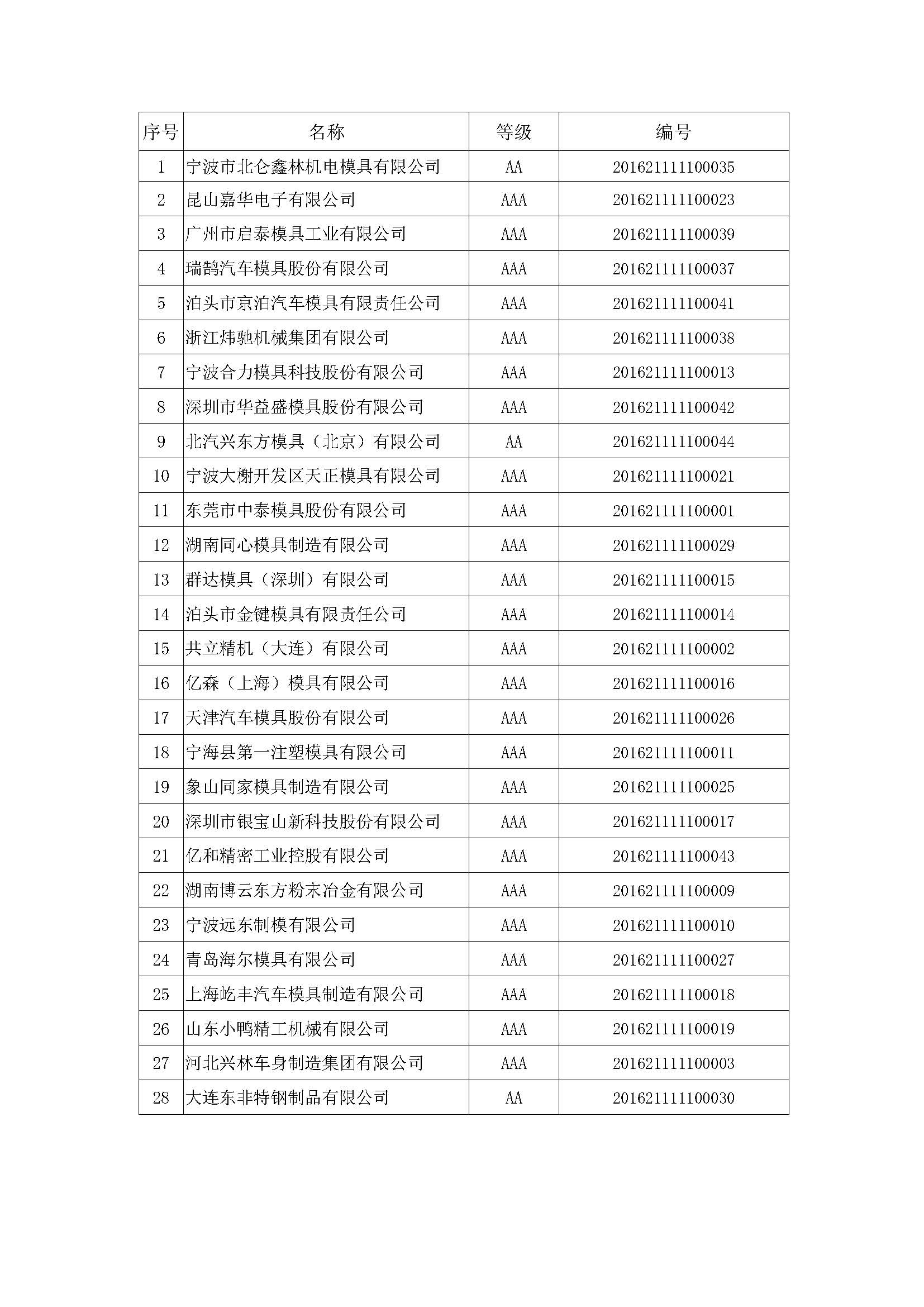 關(guān)于對“2016年中國模具行業(yè)企業(yè)信用等級評價(jià)(復評)結果”進(jìn)行公示的公告
