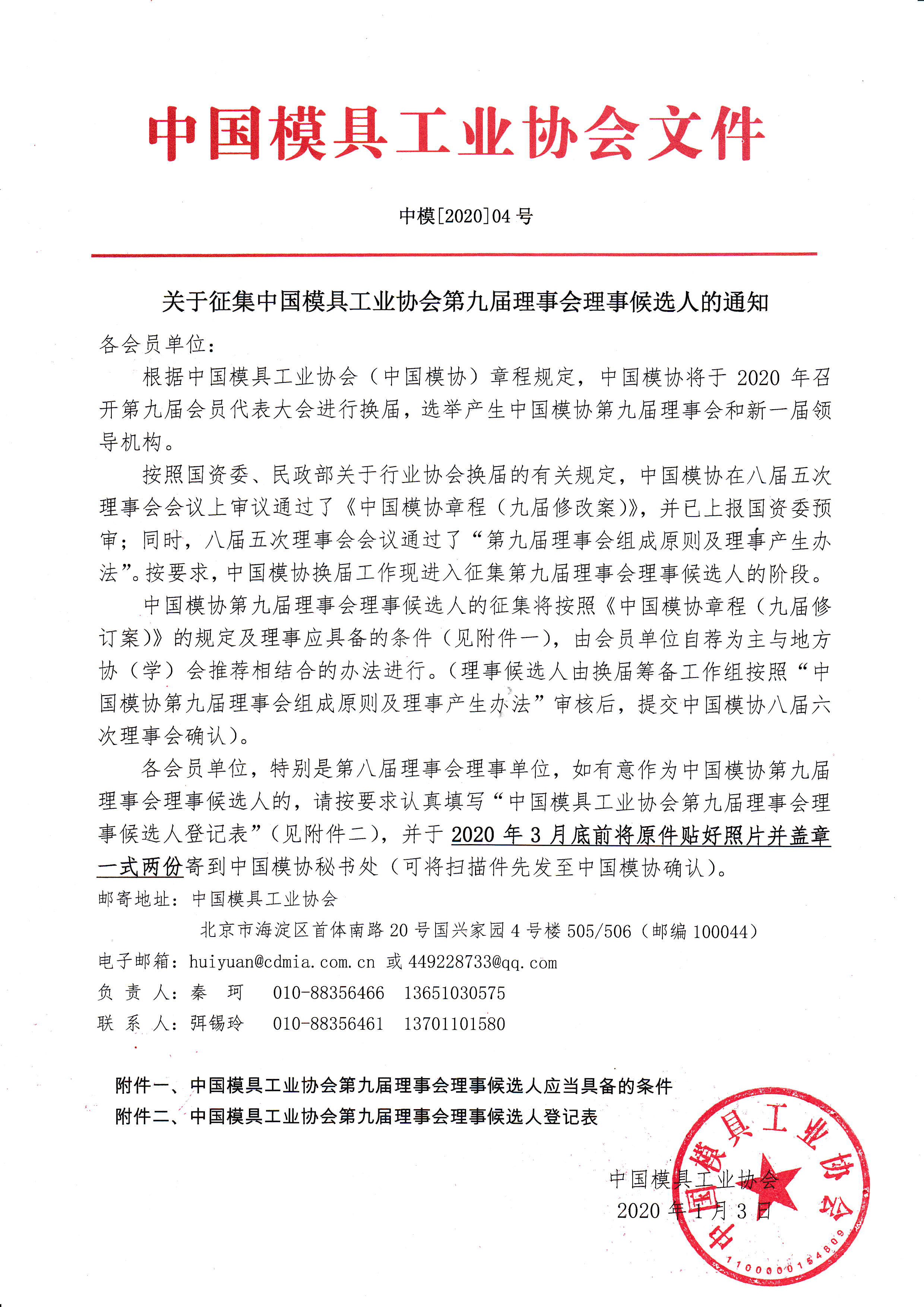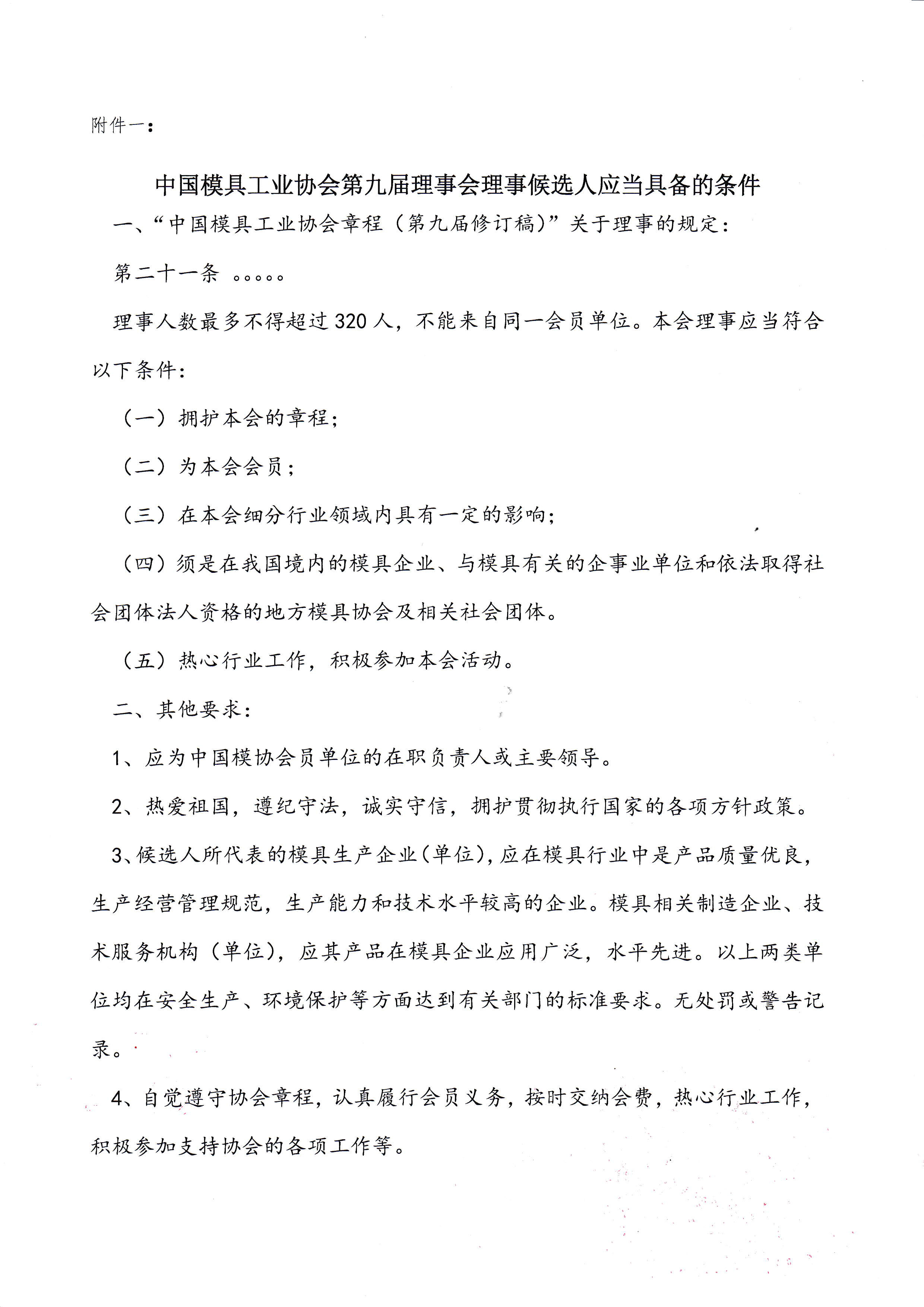 關(guān)于征集中國模具工業(yè)協(xié)會(huì )第九屆理事會(huì )理事候選人的通知