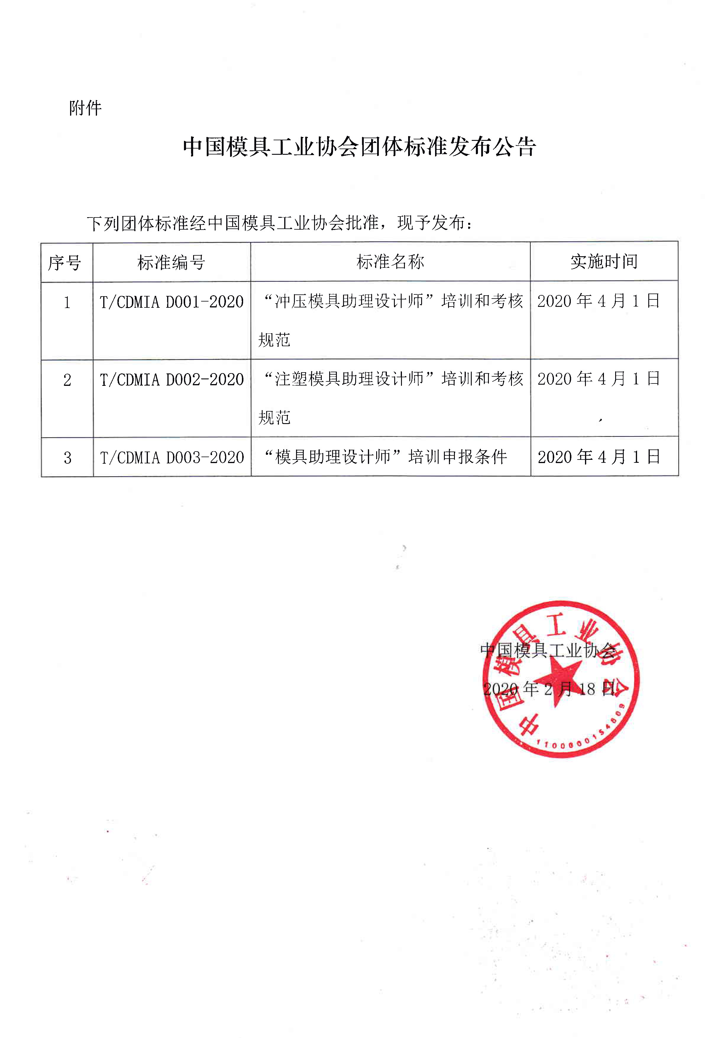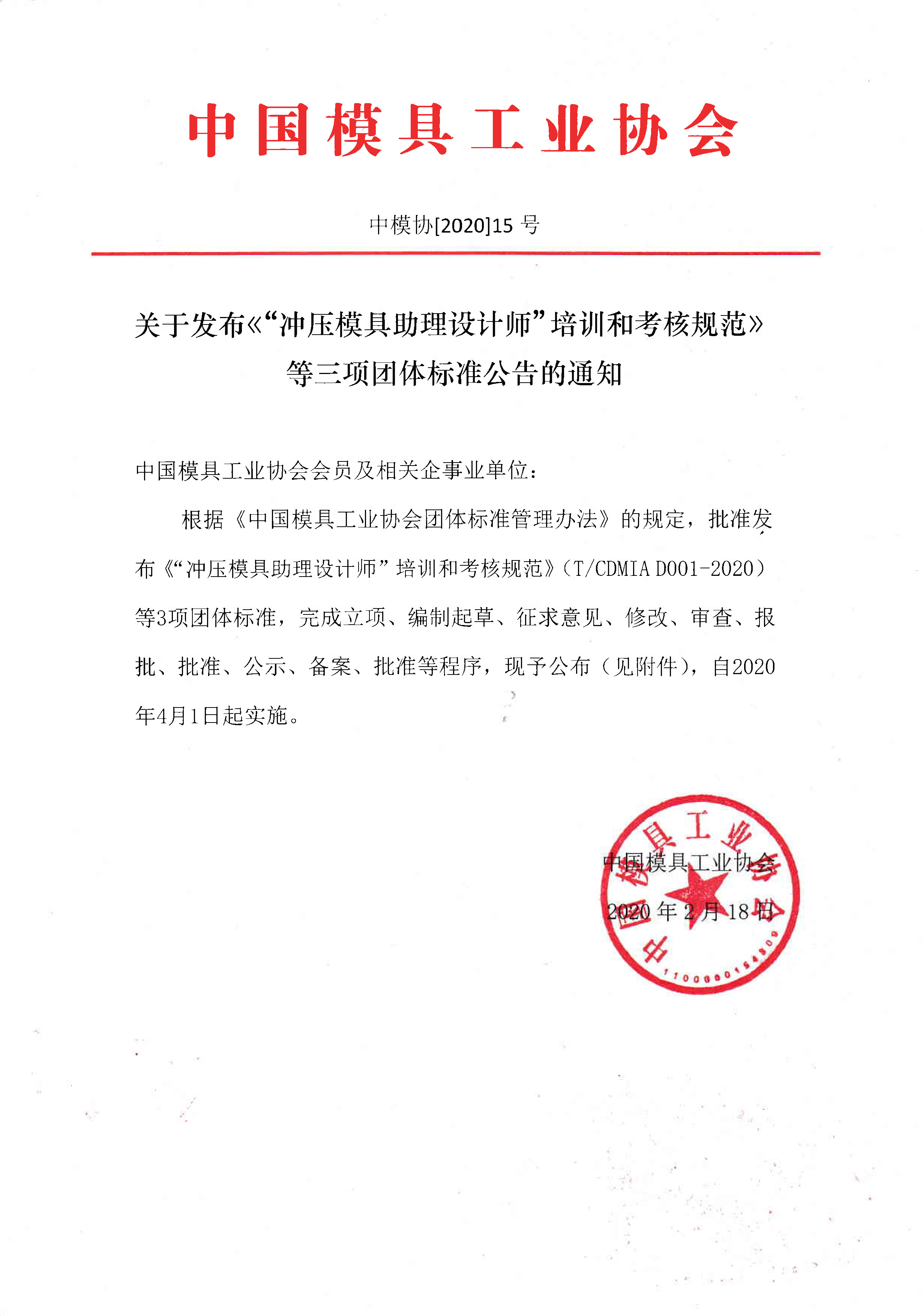 關(guān)于發(fā)布《“沖壓模具助理設計師”培訓和考核規范》等三項團體標準公告的通知