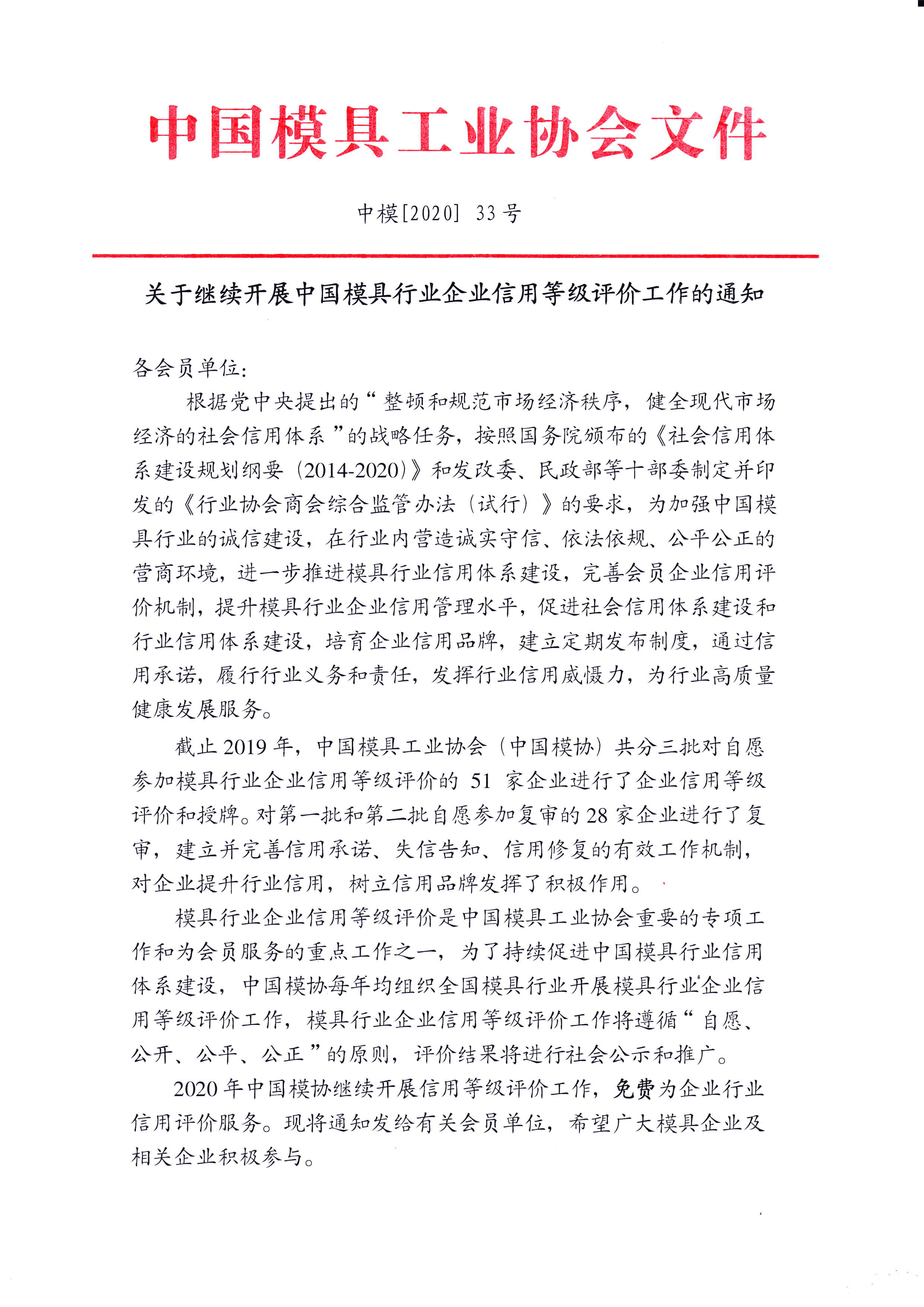 關(guān)于繼續開(kāi)展中國模具行業(yè)企業(yè)信用等級評價(jià)工作的通知