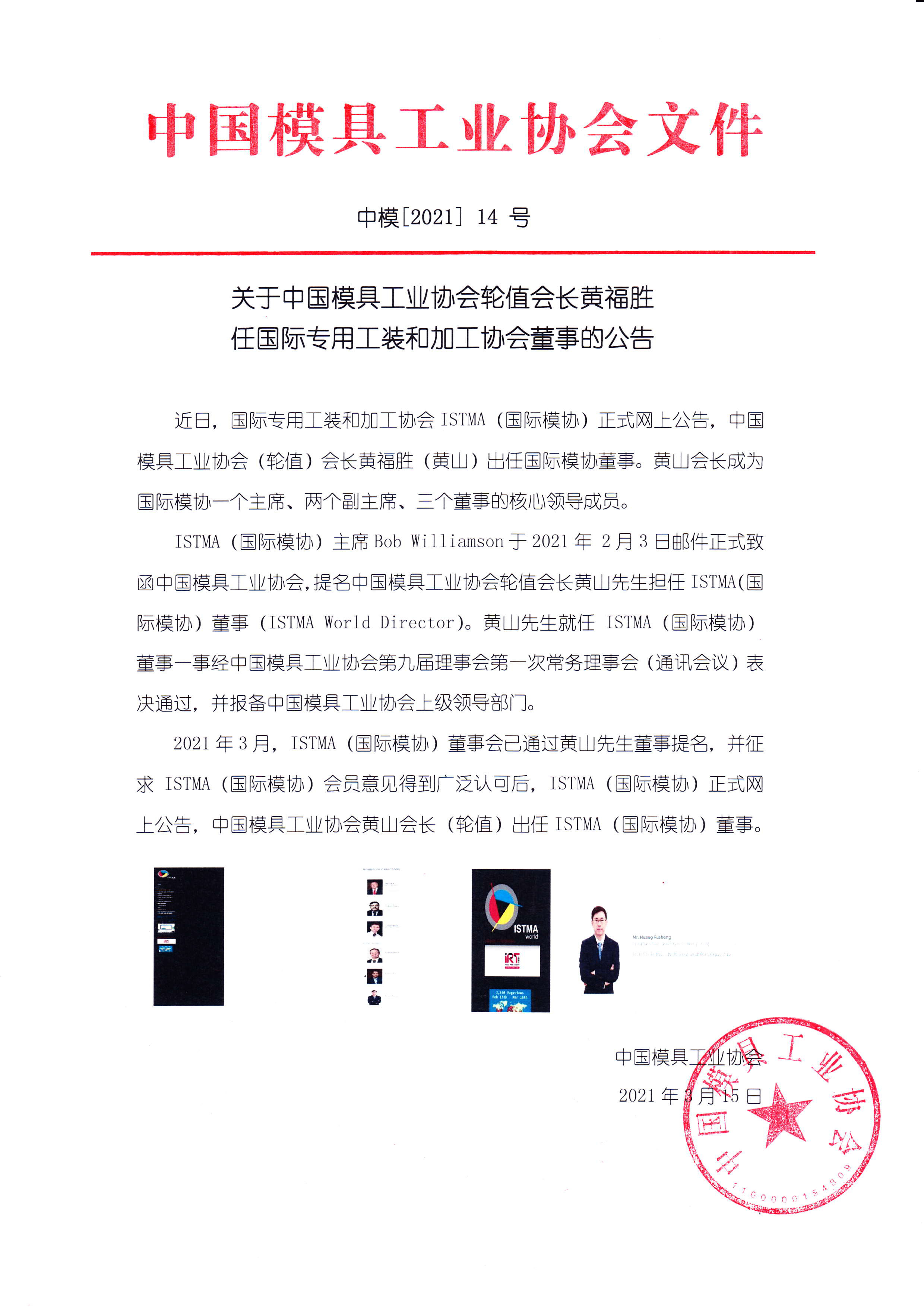 關(guān)于中國模具工業(yè)協(xié)會(huì )輪值會(huì )長(cháng)黃福勝任國際專(zhuān)用工裝和加工協(xié)會(huì )董事的公告