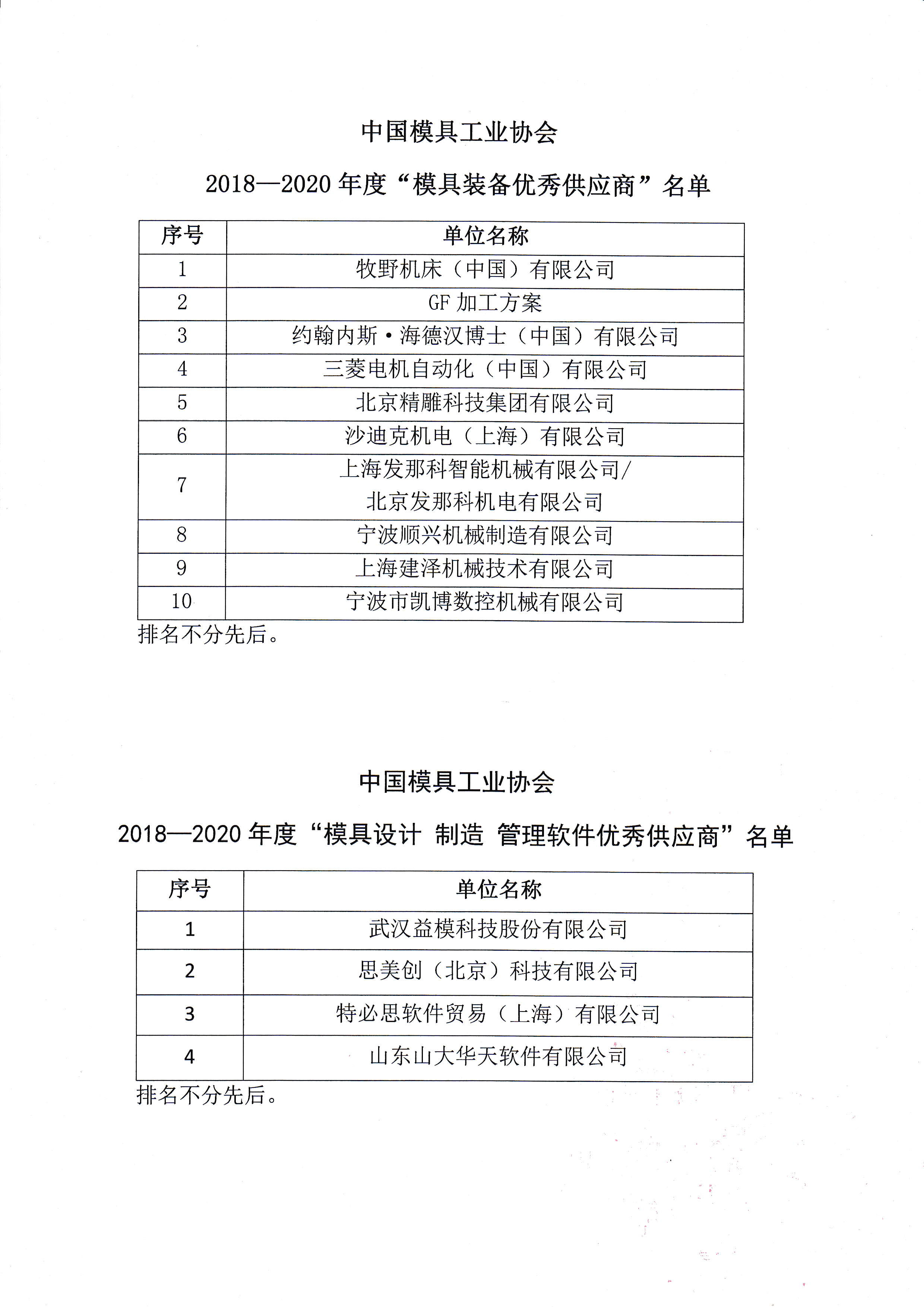 2018—2020年度 模具裝備優(yōu)秀供應商 模具設計制造管理軟件優(yōu)秀供應商 模具材料優(yōu)秀供應商 評定結果