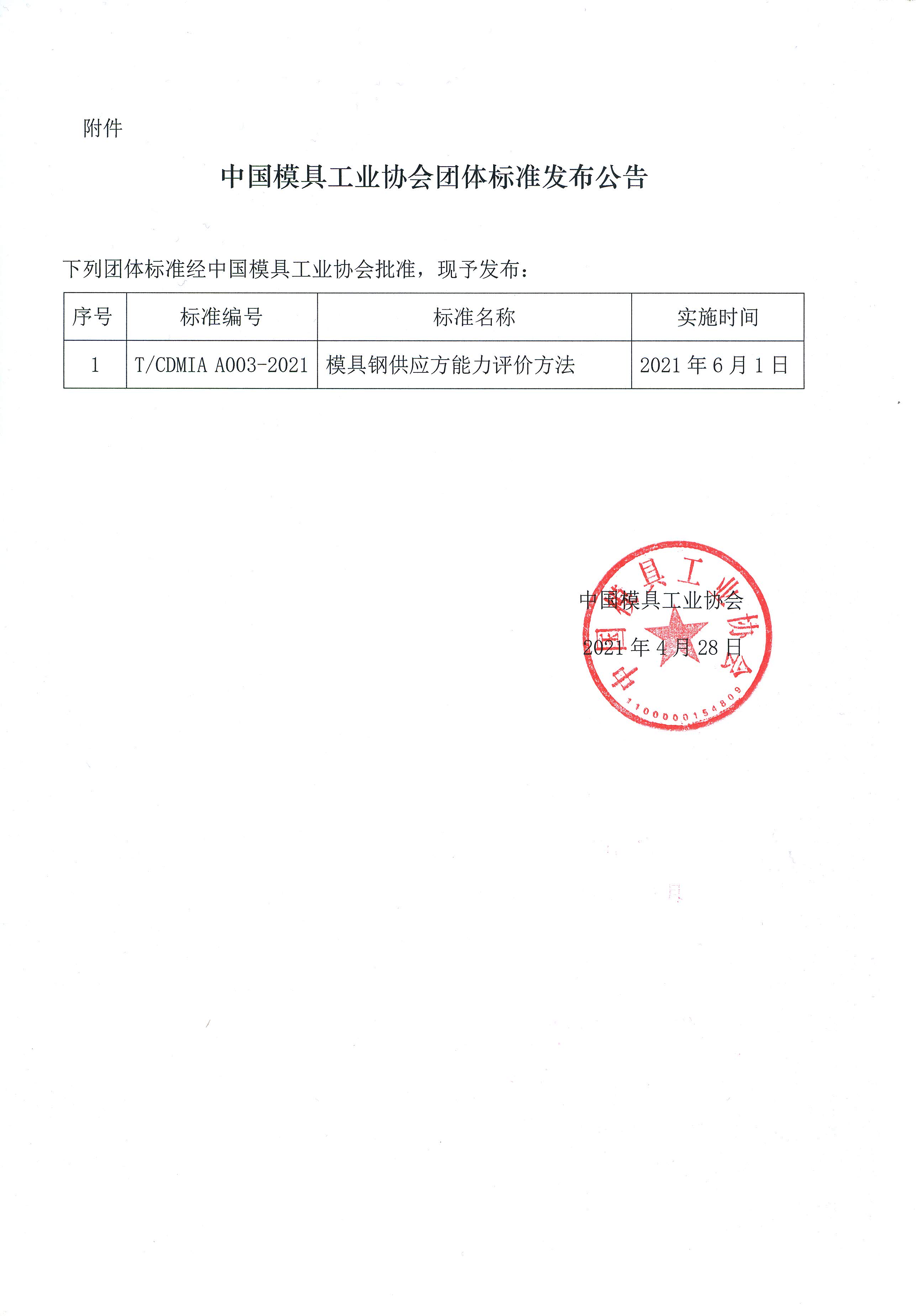 關(guān)于發(fā)布《模具鋼供應方能力評價(jià)方法》團體標準公告的通知