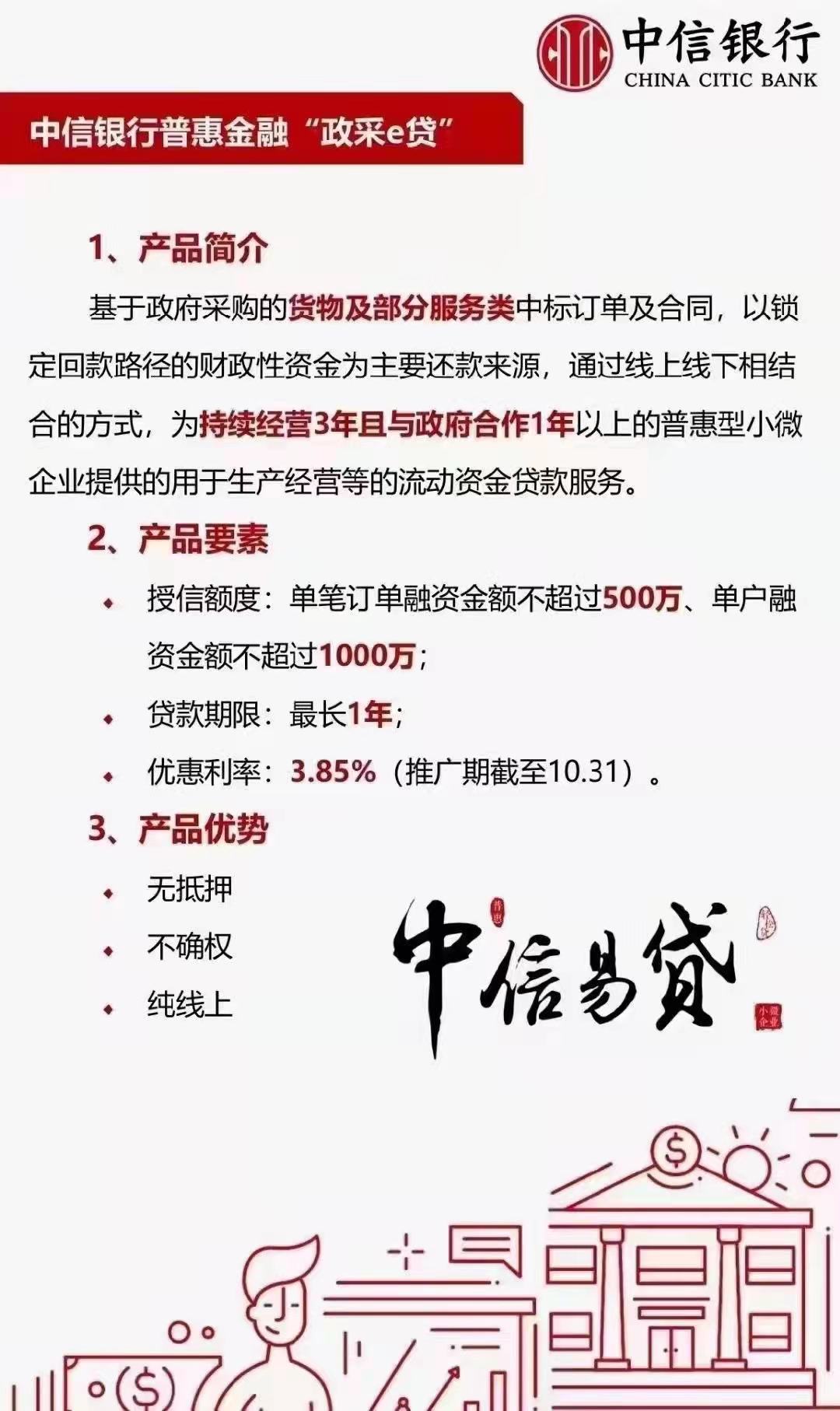 核心提示:中信銀行創(chuàng )新推出“政采e貸”產(chǎn)品,著(zhù)力幫助解決部分小微企業(yè)在中標政府采購訂單后,因信息不對稱(chēng)等原因導致的“融資難”問(wèn)題,助力實(shí)體經(jīng)濟復蘇。