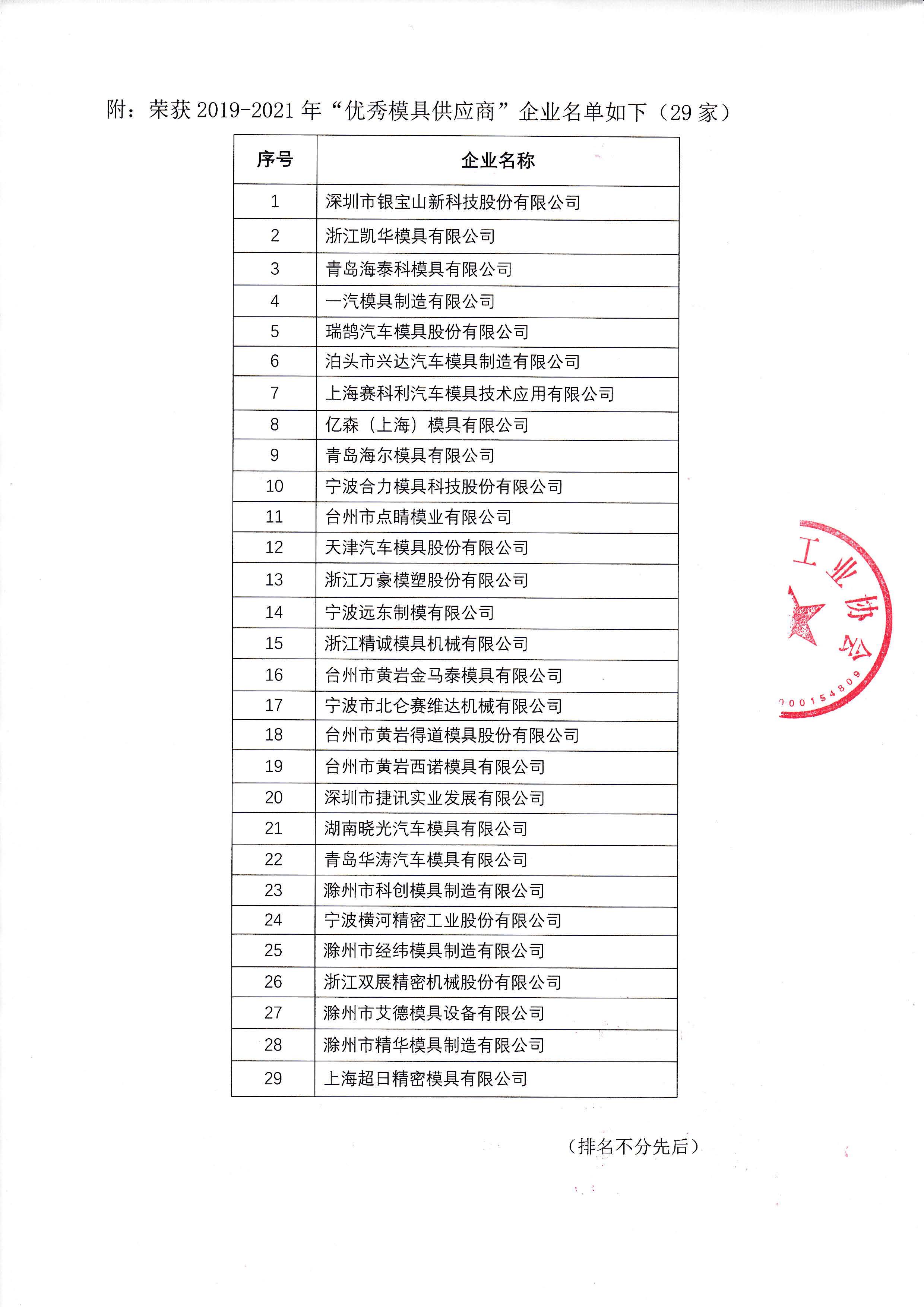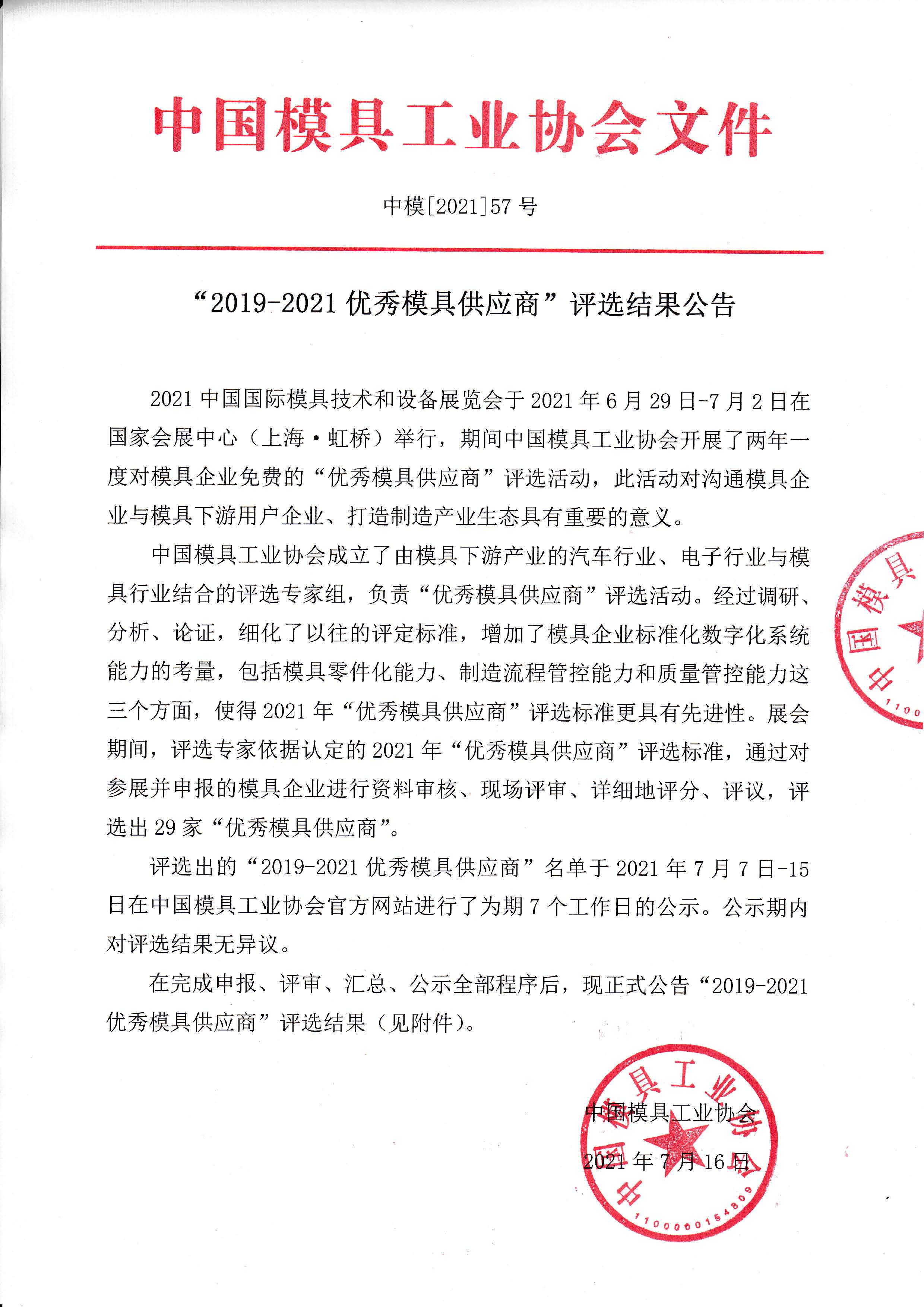 “2019-2021優(yōu)秀模具供應商”評選結果公告