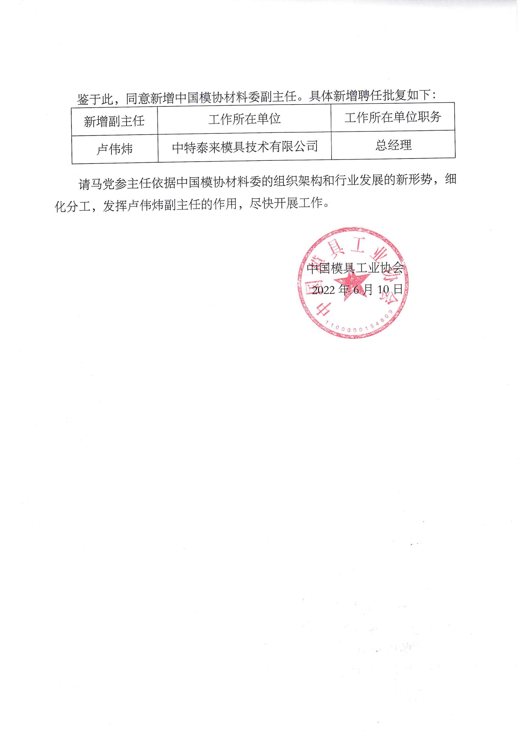 模具材料專(zhuān)業(yè)委員會(huì )新增副主任的批復
