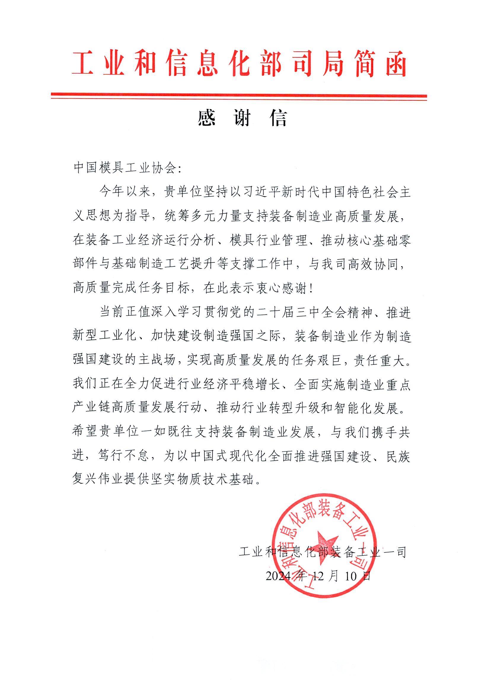 工業(yè)和信息化部裝備工業(yè)一司感謝信